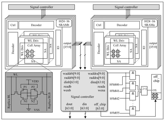 The memory structure is shown in Figure 3. The whole memory module is divided into four SRAMA and four SRAMB, and the size of an individual SRAM is 1024 × 16 bits. Each SRAMA single clock output has 16 bits, the four SRAMA output values are stitched together, and the overall output is a single clock output of 64 bits. SRAMB operates on the same principle.