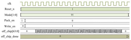 The output timing of the encrypted IP core is shown in Figure 5. During the encryption of the IP core, the off-chip port provides the ciphertext data, and the mode value is at this point 01. When the encryption module enable signal jumps from high to low, it indicates that the encryption is complete. When the encryption module enable signal jumps from high to low, it indicates that the encryption is complete. The write enable signal jumps from low to high and begins to read the ciphertext data. The output cipher text of the encryption module is 16 × 64 bits, with 64 bits of data being output in each clock, and after 16 clocks, the off_chip_done signal jumps to a high level, at which point the cipher text is all output.