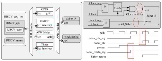 The hardware IP core of the Saber algorithm is integrated into the System on Chip (SoC) system via the APB bus, and the clock, reset and enable signals of the IP core are given by the SoC, as shown in Figure 6. The design uses the Hummingbird e203 processor. The reduction of dynamic flip power consumption is particularly important in IP core integration. This integration includes a clock gating circuit that connects to the bus, which reduces the dynamic flip power consumption of the entire IP core. The clock gating circuit uses clock and reset hosting signals to control the signal flipping of the Saber algorithm IP core. In the gated clock output timing, the system clock and reset signals are fed into the Saber algorithm IP core when the clock and reset signal register signals jump high, inserting a simultaneous global clock gating in the back-end design.