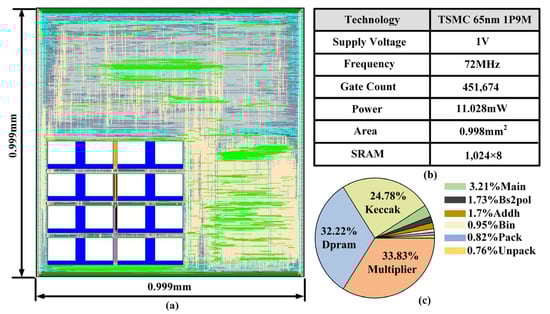 The proposed IP core was implemented under the operating conditions of 72 MHz clock frequency and 1 V supply voltage. The IP core area is 0.65 mm2, and the chip layout is shown in Figure 7. The design of the dual-port SRAM and the clock gating circuitry does not provide a distinct advantage in terms of the area of the IP core compared to existing implementations. However, this design primarily focuses on optimizing the timing and power consumption. The back-end design of this IP core is based on the TSMC 65 nm process, and the equivalent logic gate count of the IP core after conversion is 45 K. The power consumption shares of the multiplier module, register module, random number expansion module, encryption and decryption module, string conversion module, and main control module of the Saber algorithm hardware IP are shown in Figure 7.