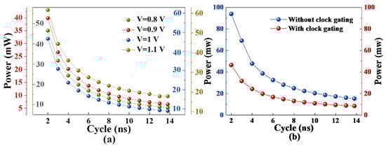 The power consumption shows that by adding the gated clock unit circuit, the power consumption of the IP core at different frequencies can be reduced by 50%, as shown in Figure 8. Using different process corners to complete the back-end design, the power consumption of the IP core at different frequencies with supply voltages of 1.1 V, 1 V, 0.9 V and 0.8 V is shown in Figure 8. The power consumption of the IP core decreases with a reduction in supply voltage. According to the power consumption report, the power consumption of the IP core does not change much when the supply voltage varies from 1 V to 0.9 V; therefore, this design is chosen to complete the backend design under the standard process tcbn65gplustc, with a voltage of 1 V.