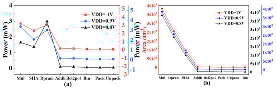 The back-end design is completed using different process corners at 72 MHz operating frequency with the various processes of tcbn65gplustc0d8, tcbn65gpluswc, and tcbn65gplustc at supply voltages of 0.8 V, 0.9 V, and 1 V, respectively. Within this design, we have analyzed the area and power consumption values for multiple modules, such as Mul (multiplier), SHA (random number expansion), Dpram (memory), Addh (shift), Bol2pol (string conversion), Bin (binomial sampling), Pack (encryption), and Unpack (decryption). These analyses were conducted at different supply voltages of 1 V, 0.9 V, and 0.8 V for various processes. The trends of area and power consumption values of each module of the IP core are shown in Figure 9. Due to the hardware adaptability of the random number expansion module, its power consumption and area consumption are at a low level. The power consumption of multiplier module is the primary concern for the IP core. Our next objective is to decrease the power consumption of the multiplier module.