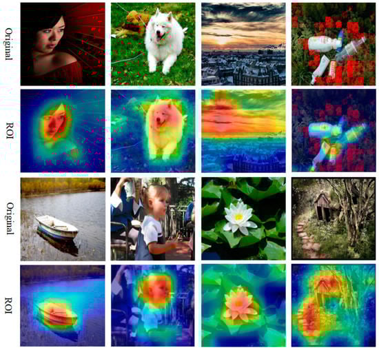 where represents the connection weight between and , means the response of , and is the normalization factor. According to (1) and (2), the recursive propagation of top-down signals can calculate the interest matrix of images layer by layer. The interest matrix represents ROI in pixels when the CNN makes decisions. In this paper, pre-trained ResNet50 is used to extract the interest matrix. Some examples are shown in Figure 2. ROI of images is highlighted by the pseudo-color technique. In Figure 2, ROI not only distinguishes between the foreground and the background, but also displays the degree of neural attention.