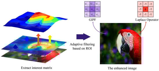 The process of adaptive filtering. The adaptive filter analyzes the interest degree in each pixel depending on the extracted interest matrix. GIPF or Laplace filter is dynamically selected to simulate human eyes.