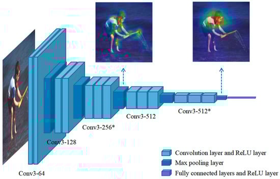 Current studies have found that there are different meanings of features learned by a CNN at different learning stages [13]. The shallow feature contains the low-level information of images, such as color, edge, and texture. The deep feature perceives abstract semantic information. Zhang et al. fuse an SPP layer and sobel-based attention layer. The output of the SPP layer is the result of down sampling the input image [16]. Moreover, they fuse the output of the feed-forward peripheral subnet and the output of the foveal subnet [17]. The output of the feed-forward peripheral subnet is low-resolution, and it goes through several convolution layers. The output of the SPP layer and the output of the feed-forward peripheral subnet are shallow features with a few convolution layers [16,17]. Similar to InceptionNet [9], the SDFF module broadens the network structure, aiming to improve the performance of models. In CNNs, VGGNet is a neural network stacked with convolutional layers. VGGNet has a relatively simple network structure. We use VGG16 [12] as the baseline and extract the shallow feature and the deep feature from different convolution layers. Figure 5 shows an example of the results. The main parameters of VGG16 are listed in Table 2. The max pooling layer after each convolution layer is omitted. From the Conv3-256* layer, we extract the shallow feature, whose size is after passing through the max pooling layer. The deep feature is taken from the Conv3-512* layer. Its size is . The above process is mathematically expressed as:
