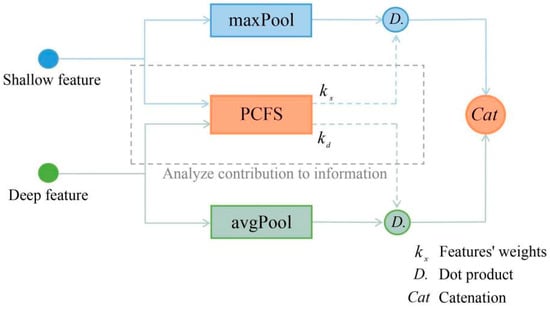 The framework of FFU. PCFS analyzes the contribution of features. Meanwhile, features pass through the max pooling layer and the average pooling layer, respectively. FFU dot pooled features with their weights and then fuse the results via the catenation layer. The gray dotted box represents the process of analyzing the contribution without changing the features numerically.