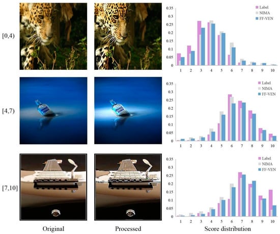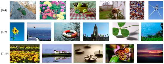AVA dataset [34]: the AVA dataset is a popular dataset for IAA because of the large number of images, the diversity of content, and the consistency of data. It can be seen at http://www.dpchallenge.com/ (accessed on 11 December 2021). For an image, there are 66 semantic labels, 14 style labels, and a label distribution with 10 scores (from 1 to 10). In the AVA dataset, higher scores mean higher quality. For an image with the average score in a certain interval, its score distribution tends to be Gamma or Gaussian [34]. Figure 7 shows some examples from the AVA dataset. On average, each image is assessed by about 200 people, including professional image workers, photographers, and photography enthusiasts. The AVA dataset contains more than 250,000 images. We removed the images whose variance is high or whose average score is 5. Thus, 235,086 images were used for training, 18,987 for verification, and 1000 for testing.