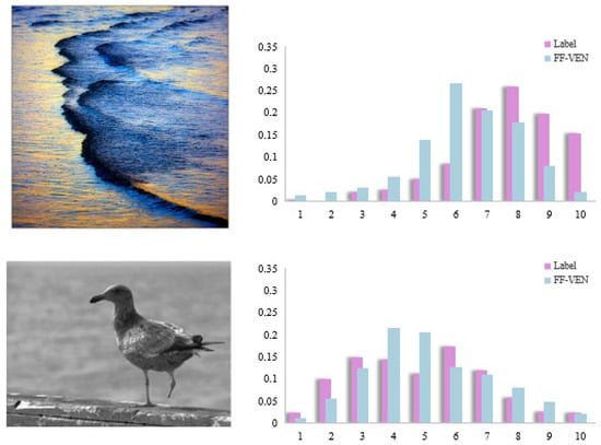Figure 8 shows some examples of images with Mean in different intervals for comparison. It can be seen that the difference between the distribution predicted by FF-VEN and that of the labels is smaller than the other two. Images with Mean in [7, 10] are less controversial. Most people give these images high scores. The composition of professional images is abstract and artistic, which is difficult for CNN to learn. From the above experiments, it seems that the VE module enhances the features of images based on human visual characteristics, leading to improving the prediction confidence of FF-VEN. Figure 9 shows some failure cases of FF-VEN. The network we trained does not perform well on images with very non-Gaussian distributions, such as bimodal or very skewed distributions. However, the Gaussian functions perform adequately for 99.77% of all the images in the AVA dataset [17].