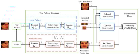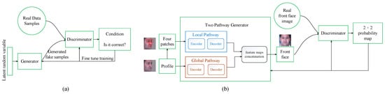 Huang et al. proposed a two-pathway GAN (TP-GAN) [] for photorealistic frontal view synthesis by simultaneously perceiving global structures and local details. As shown in Figure 2b, TP-GAN uses two pathways in G to perceive global structures and local details simultaneously. Four landmark-located patch networks, in addition to the commonly used global encoder–decoder network, are used to attend to local textures. Then, the positive synthesized image is used for the downstream task: identity recognition.