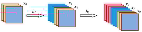 The lightweight FER model in this paper is based on DenseNet’s feature reuse strategy, which is shown in Figure 3. In a dense block, the original feature x0 is inputted into the layer, h1, and x1 is the output. The input of the layer h2 includes not only x1, the output from the layer h1, but also the original feature x0. The input of the layer h3 includes not only x2, the output of layer h2, but also x1 and x0.