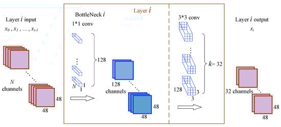 The non-linear transformation function H(·) in dense block is defined as batch normalization(BN) + rectified linear unit (ReLU) +3 × 3 convolution. As the number of layers increases, the number of input channels increases dramatically with the number of overlapping feature maps. For this reason, a 1 × 1 conv is used before the 3 × 3 conv to limit the number of input channels. Then H(·) is defined as BN + ReLU + 1 × 1 Conv + BN + ReLU + 3 × 3 Conv. Assume that the input size of layer i in a dense block is 48 × 48, the feature maps of all the preceding layers are concatenated with N channels, the bottleneck layer reduces the number of channels to 128, and the growth rate k (the number of output channels per layer; i.e., the increase number of input channels in the next layer after concatenation) is 32. Then, the operation of layer i is as shown in Figure 4.