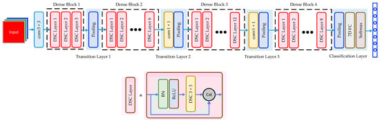 Because of its use of DSC, we refer to this network, which is shown in Figure 6, as DSC-DenseNet. The parameters of its components are given in Table 1.