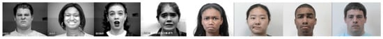 Extended Cohn-Kanade Dataset (CK+) []: It is one of the most widely used expression datasets, and was released in 2010. There are 593 sequences in it, and each sequence begins with a neutral expression and proceeds to a peak expression. FER based on a static image often takes the last frames as samples. The eight included expressions are disgust, happiness, surprise, fear, anger, contempt, sadness, and neutral, as shown in Figure 8.
