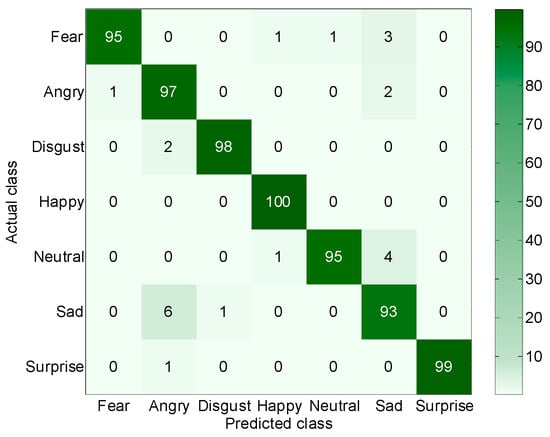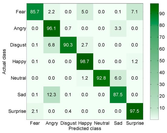 In the study, the frontal images generated by LD-GAN were recognized by DSC-DenseNet. The mean FER recognition rate of each expression, at all views, was calculated, and the confusion matrix of seven facial expressions was derived, as is shown in Figure 16.