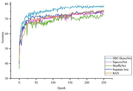 We performed comparison experiments on Fer2013 to compare our model to the classical lightweight classification models (SqueezeNet, ShuffleNet, ResNet, and MobileNet) and the state-of-art classification models (Separate-loss and RAN). The learning curves of some models are shown in Figure 13. We also compared our model to recently proposed FER models (Light-SE-ResNet and PGC-DenseNet). The FER recognition rate, params, and FLOPs of these models are shown in Table 5 (sorted by recognition rate).