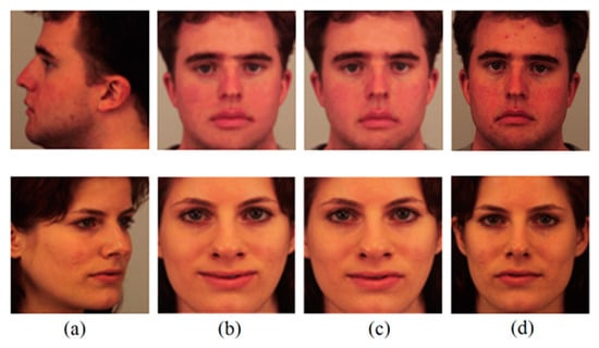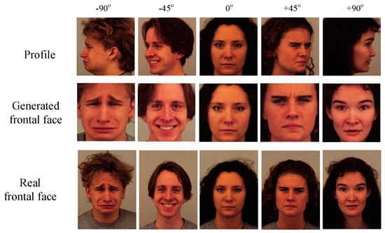 The FER algorithms mentioned above focus on the front face image, but since the facial deflection at various angles cannot be avoided in natural environments, the accuracy of FER is more or less lowered []. Therefore, pose normalization is performed before FER; i.e., the face is corrected to the front view in the case of deflection.
