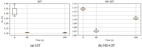 Boxplot of the data measured with sweep, following a drain-source static stress () at ; sample size of each box: . Instability on results particularly for the GIT device immediately after the stress.