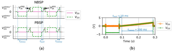 (a) Definition of the triple sense protocol (in accordance with [23]); the chronograph shows the preconditioning stress followed by the measurement ramp for the negative and positive bias stress protocols (NBSP and PSBP, respectively), with the definition of and as the measurements following a negative or positive gate stress, respectively; and (b) Signal measured on the the B1505A analyzer output for protocol programmed in HP BASIC; ms, depends on the value of measured and is in the order of hundreds of milliseconds.