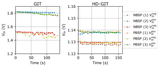 The chosen values for the bias stress are summarized in Table 6. For both the GIT and the HD-GIT, the limit voltages were used. Each bias stress was applied for s.