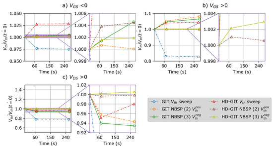 Three series of measurements were performed for each device and each static stress type. The results of a single series are presented in Figure 5, normalized to the first measurement () for each set. Therefore, Figure 5 shows the variation of the measured value of vs. time.