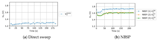 An example of an application of the triple sense preconditioning protocol is given in Figure 6. The GIT device was submitted to a series of V static stress lasting s, and the was measured using either the NBS protocol or the direct sweep after each stress. The values obtained with the direct sweep vary constantly, but the NBSP was able to stabilize it, again proving its robustness. It shows that the measurement of with the triple sense protocol is a more reliable method to ascertain the effect of any degrading stress on the transistor.
