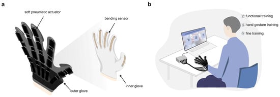 The rehabilitation glove system proposed in this article mainly consists of a pneumatic actuator module, sensor module (bending sensor and air-pressure sensor), main control module, rehabilitation training mode, and human-computer interaction interface. In order to achieve the integration of rehabilitation training and functional evaluation data, the rehabilitation glove adopts an inner and outer two-layer structure, as shown in Figure 1a. The component layout of the design is based on the anatomical and physiological structure of the patient’s hand, and the glove material is selected to have good force transmission and flexibility to improve hand-glove contact. The outer layer of the glove provides support for the flexible actuators which are pneumatically actuated to assist fingers in rehabilitation training. The bending sensor in the inner glove fits the hand and can track subtle changes in the motion ranges of the patient’s fingers. At the same time, the bending angle information is monitored in real-time based on the feedback technology to achieve safe and reliable rehabilitation training. In addition, the microcontroller, with a rich interface and excellent processing performance, communicates with the human–computer interaction interface, which facilitates patients to make their own rehabilitation training plan and monitor the progress of rehabilitation, creating data, as shown in Figure 1b.