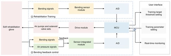 Figure 2 outlines the workflow of the rehabilitation glove. The distinctive feature of this rehabilitation glove lies in the integration of sensing and rehabilitation control. Firstly, the inner glove captures the five-finger bending signal, and after amplification and AD conversion, it is transmitted to the human-computer interaction interface, automatically entering the program setting, and displays the training threshold. The patient sets the training parameters according to the needs of hand rehabilitation, and controls the rehabilitation process autonomously. After the system officially starts, the controller controls the pneumatic actuator module to enter the working state, according to the instructions sent by the human-computer interaction interface. By changing the air pressure inside the rehabilitation glove chamber, finger flexion or extension movement can be realized. It is worth noting that during the entire rehabilitation training process, the air pressure and bending-sensor module continuously monitors the pressure and bending-change data generated by the training in real-time, and graphs it so that patients can clearly understand the actual rehabilitation training situation. At the same time, the controller continuously judges whether the current bending angle reaches the set motion threshold, so as to achieve accurate feedback control.