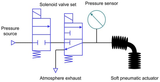 A pneumatic circuit consisting of air pumps and solenoid valves is essential to ensure that the module performs its intended tasks precisely and reliably. For the coordination and dexterity of the patient’s fingers, the pneumatic circuit in this paper includes five pneumatic branches with the same working principle, and are independent of each other, which sequentially control the flexible pneumatic actuators corresponding to the five fingers. Each pneumatic branch is realized by a combination of a two-position, two-way solenoid valve and a two-position, three-way solenoid valve. The micro air pump provides sufficient positive pressure or negative pressure air-source power for the pneumatic circuit, as shown in Figure 3. We take a single pneumatic branch as an example to provide an overview of the workflow. The flow direction of the gas in the circuit can be changed by changing the position of the valve body when the solenoid valve coil is energized and de-energized. The different on-off combinations of the solenoid valve and the air pump determine the different deformations (swell, static, and systolic) of the flexible pneumatic actuator, corresponding to the different states of the pneumatic circuit (inflation, holding, and exhaust), and can drive the fingers to flex, hold, and perform stretching exercises; the corresponding relationship is shown in Table S2. The connection between the air pump and the solenoid valve group uses PVC pipes, and the connection positions of each branch are connected with hose connectors that match the inner diameter of the PVC pipes. In order to improve the airtightness of the pneumatic circuit, stainless steel clamps are used to fasten each interface. In addition, in the hold and exhaust state, excessive air pressure will be accumulated between the air pump and the two-position, two-way solenoid valve, threatening the life of the air pump and the solenoid valve. In order to solve this problem, we design a pressure relief branch composed of a pressure relief valve (normally closed, two-position, two-way solenoid valve). When the pneumatic circuit is in the hold or exhaust state, the pressure relief valve is turned on to release excess air pressure. When one or more branches are in an inflated state, the pressure relief valve is powered off to prevent the air pressure in the cavity of the flexible actuator from being connected to the atmospheric environment to avoid partial pressure leakage.