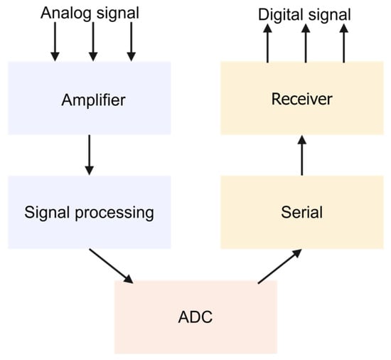 In the process of connecting the bending sensor and the controller, since the input impedance of the controller will change the input resistance of the sensor, it will affect the accuracy of the sensor. In order to solve this problem, we use a dual operational amplifier for regulation. The amplifier includes two independent, high-gain, internal frequency-compensated operational amplifiers, which can effectively reduce the error caused by the source impedance on the measurement results by using the characteristics of low-bias-current (Figure S1). Figure 4 shows the signal processing process of the sensor module. The analog signal collected by the module is first amplified by the operational amplifier, then through signal processing, ADC conditioning, serial communication and other steps, and finally received by the customized human-computer interaction interface.