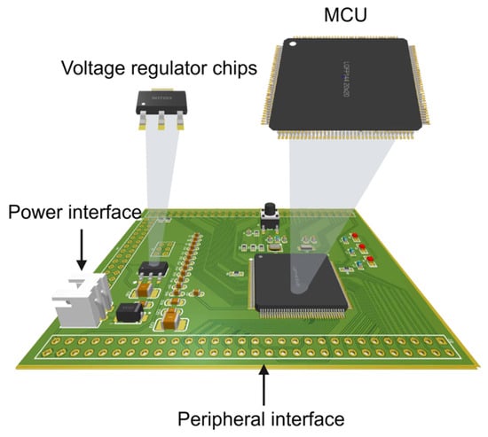 We developed a battery-powered main control circuit board for data processing and control, as shown in Figure 5. The main control circuit board consists of MCU, power management module, bending-sensor conditioning circuit, and I/O interfaces (Figure S2), which are integrated on a fast-prototyping PCB board patterned using a UV laser system (LPKF; Protolaser U4). The power management module is composed of a 12 V lithium battery combined with a voltage regulator chip, which provides 12 V, 5 V, and 3.3 V power supply for different modules of the rehabilitation training system. The ingenious design of the voltage regulator circuit can prevent voltage inversion after power failure and suppress self-excited oscillation, ensuring the stability of the entire system. In order to take into account the weight, integration, and circuit design requirements and cost of the flexible rehabilitation glove system, using reflow soldering technology will solder the bending-sensor conditioning circuit on the main control circuit board. The external interfaces bring convenience to the overall system construction. Both the bending-sensor and the air-pressure sensor module are connected to the relevant pins of the main control circuit board through wires to continuously monitor the bending and air pressure signals, respectively.