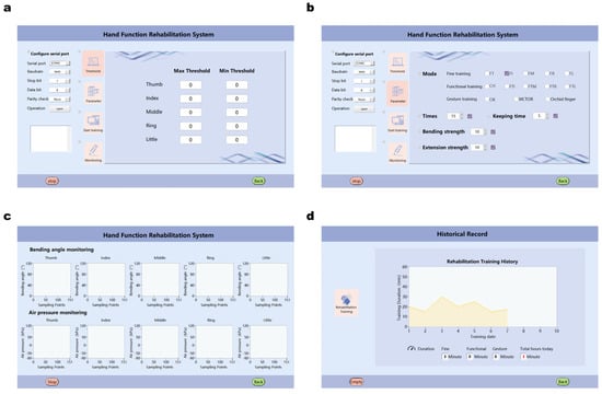 The designed human-computer interaction interface includes login management, user information, rehabilitation training, and history record functions. When the patient clicks on the corresponding button to trigger the system’s specific function, the target interface will automatically display the next step of operation prompts, assisting the patient in quickly mastering the use of the system. In this study, the rehabilitation training interface and history record interface were selected for demonstration. Before starting the formal rehabilitation training, the patient puts on the flexible rehabilitation glove and completes the fist and flat hand actions after clicking the “movement threshold” button. The software interface will display the maximum and minimum movement thresholds for the five fingers (as shown in Figure 6a). After the patient clicks the “training parameters” button to enter the corresponding interface, they can choose the rehabilitation training mode according to their own status, set the rehabilitation training times, duration, and intensity (as shown in Figure 6b). The intensity setting range is from 0% to 50% (0% intensity is the maximum). After clicking the “data monitoring” button, the bending and air pressure changes of each finger during the rehabilitation training process will be presented via a waveform in the interface (as shown in Figure 6c), which is convenient for the patient to observe the actual training status more intuitively and clearly. In addition, clicking the “return” button can return to the previous interface. The history record interface can continuously and truthfully record the patient’s daily rehabilitation training progress (as shown in Figure 6d), which helps the patient understand the rehabilitation trend and adjust the rehabilitation plan in advance. It is worth noting that we have designed an “emergency stop” button on all interfaces of the system to deal with external emergencies and urgent situations, further ensuring the safety of patient rehabilitation training.