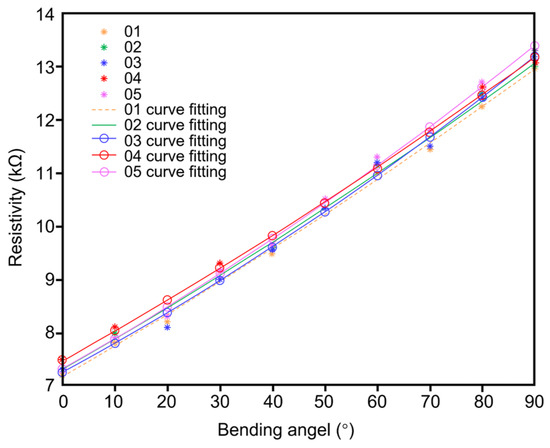 In order to obtain an accurate characteristic relationship between the resistance value and the bending angle of each bending sensor, we conducted a calibration experiment on the bending sensor. The bending sensors fixed on the back of the thumbs, index fingers, middle fingers, ring fingers, and little fingers are labeled as 01–05, respectively. During the calibration process, the internal resistance value of the bending sensor is measured using a multimeter, and the angle change is measured by an angle-measuring ruler. The experiment recorded the changes in the internal resistance values of the five bending sensors corresponding to bending angles from 0° to 90° (with intervals of 10°), and the resistance values for each bending angle of each sensor were the average of three calibrations (Table S5). The calibration results were curve-fitted using the least squares method to obtain Figure 7. From the figure, it can be seen that the resistance value of the bending sensor depends on the deformation of the sensor, and the two are proportional, with the resistance value increasing with the increase of the bending angle.