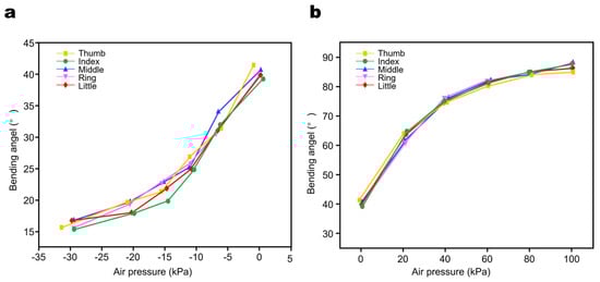 Air pressure and bending characteristics of the five finger actuators. (a) Bending angle and air pressure characteristic curve of actuator under negative pressure condition; (b) Bending angle and air pressure characteristic curve of actuator under positive pressure condition.
