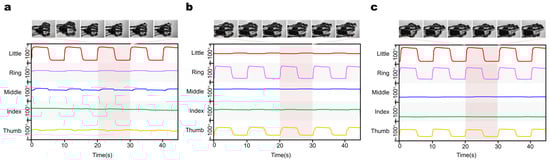 (a) training effect of “FL” gesture and change of finger bending angle; (b) training effect of “FTR” gesture and change of finger bending angle; (c) training effect of “VICTOR” gesture and change of finger bending angle.