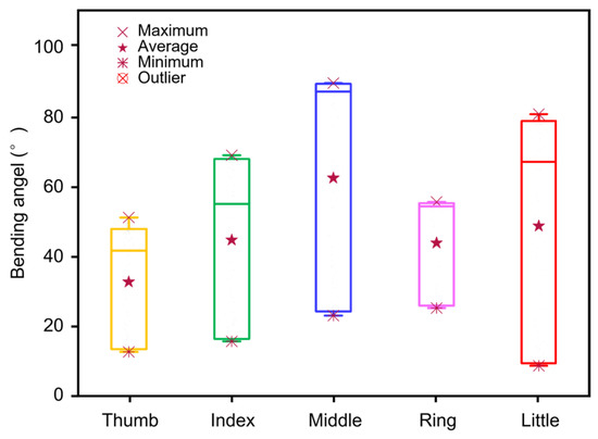 The goal of this experiment is to verify whether the proposed flexible rehabilitation glove system can ensure the safety of patients. To avoid introducing human intention noise or other interference during the experiment, a flexible glove was placed on a flat table and the experiment was carried out without load. Prior to the experiment, a participant was randomly selected and their finger movement threshold was recorded as the safety assessment experiment threshold and entered into the rehabilitation training system, as shown in Table S10. As the safety performance experiment involved five fingers, the “CH” function training mode was selected. The number of training sessions was set to six (i.e., a duration of 1 min), with a hold time of 5 s, a bending intensity of 10%, and an extension intensity of 10%. The bending angles of each finger during the training process were monitored in real-time, and the minimum/maximum bending angles of the five fingers were recorded for each session (Tables S11 and S12). The distribution characteristics of the bending-angle data of each finger for each training session were analyzed by drawing box plots, as shown in Figure 10 and Figure S7. The box plot directly reflects the maximum, minimum, mean, and outlier values of finger movement. It can be seen that no abnormal values were observed in the bending data of each finger during any of the training sessions.