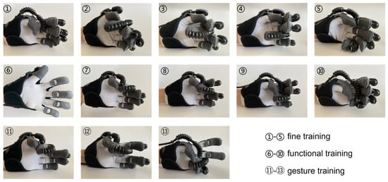 A number of diseases or injuries can lead to hand damage, such as stroke [1], Parkinson’s disease [2], incomplete spinal cord injury [3], or traumatic fractures [4]. It is reported that up to 60% to 70% of stroke patients have unilateral hand motor impairment [5,6]. Specifically, hand movement disorders mainly include joint movement disorders, hand coordination disorders, or sensory abnormalities [7,8], which will significantly limit the independence of patients, reduce their quality of life and hinder their livelihoods, as well as the entire society [9]. Clinical research has shown that repeated passive movement of the affected hand can reversely stimulate brain reorganization (neural plasticity) and improve hand-motor function [10,11]. Therefore, rehabilitation training is essential for patients with hand injuries, which aims to help patients recover to a normal state [12,13]. However, due to the complexity of finger movements, hand-function rehabilitation is a challenging and lengthy process [14].
