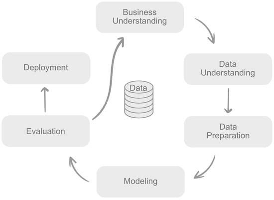 The most commonly used methodology in practice and the most cited in the literature is CRISP-DM (CRoss-Industry Standard Process for Data Mining) [34]. CRISP-DM is a process consisting of 6 distinct phases that are approached sequentially at a nominal level, but the process itself is iterative, meaning that all models and understanding are designed to be improved by subsequent insights gained throughout the process. CRISP-DM is illustrated in Figure 1 below and work as follows: