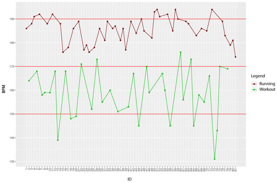 Based on these results and interactions with the respondent, we can confirm the accuracy of the wearable device based on the observed heart rate attribute. Based on the medical data analysis regarding heart rate and the processed study regarding the target heart rate zone during exercise, we observed Respondent ID-11 had average heart rate values during Functional Strength Training that fell within the norm of the target zone during exercise. The target heart rate zone during exercise is the range of heart rate that you should aim for during physical activity to achieve the most cardiovascular benefit from your workout. This range is typically defined as a percentage of your maximum heart rate, which is the highest number of times your heart can beat per minute. Consistent moderate or vigorous running gets our heart rate up, thus increasing its longevity and capacity in the long term [40]. Exercising will strengthen your heart and lungs, but most importantly, your resting heart rate will begin to decrease [41]. Next, we presented the heart rate results between Functional Strength Training and Running, where we saw significant differences in maximum heart rate values, which confirms the fact that there is a visible difference in exercise intensity between the two workouts.