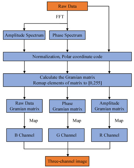 For the images generated by the existing GAF, there are three channels. However, the pixel matrices of the three channels are equal, which leads to two problems. First, there is no difference in the features of the three channels. Even if pseudocolor image processing is performed later, the missing amplitude feature and phase feature still cannot be offset. Second, since the pixel matrices of the three channels are equal, the update of the convolution kernel based on the data of three channels in the iterative process is equivalent to the update based on the data of only one channel. In this case, the convolution of a three-channel image using a three-channel convolution kernel is equivalent to the convolution of a single-channel image using a single-channel convolution kernel. The feature extraction capability of the three-channel convolution kernel is not fully utilized, and thus the final performance of identification could be degraded.