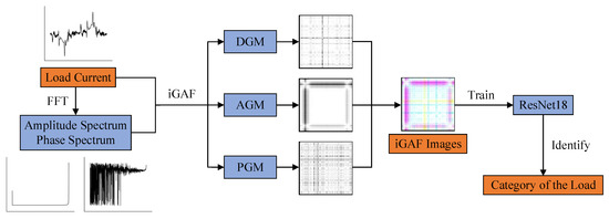 The objective of load identification is to categorize the load with the recognition of load electrical signals. The nature of load electrical signals is discretized time-series data. If the time-series data is transformed into an image using some sequence-to-image (seq2img) methods, the load identification problem can be treated as the image classification problem. Voltage–current (V-I) trajectory is commonly used to transform voltage and current data into images [8,9,10]. Voltage is plotted versus current to reflect features of load electrical signals. However, the granularity and color information of images are usually missed in such a method, and features of raw data cannot be fully reflected. The recurrence graph (RG) is another seq2img method. The appliance recognition utilizing the recurrence graph technique and CNN was studied, and the weighted recurrent graph (WRG) generation was presented by given with one-cycle current and voltage in [11]. It was shown that an image-like representation with more values can be produced by the WRG to improve appliance recognition performance. In [12], the adaptive weighted recurrence graph (AWRG) was discussed to solve the problem of hyperparameter tuning. It is shown in [13] that the unthresholded recurrence plots are able to work as feature inputs for a vast range of time series classification problems, and the voltage–current trajectory was transformed into two unthresholded recurrence plots. Then it was classified using a spatial pyramid pooling convolutional neural network in [14]. The recurrence graph is helpful in transforming load electrical signals into images. However, the performance of such a method partly relies on the hyperparameters selection. The quality of the generated images can be affected by the selection of hyperparameters. The Gramian angular field (GAF) and the Markov transition field (MTF) were proposed in [15] for encoding time series as images. The time series was represented in a polar coordinate system, and the Gramian matrix was calculated in GAF. Each element of the Gramian matrix was the cosine summation of angles. The MTF was developed to build the Markov matrix of quantile bins after discretization, and the information of the raw data can be encoded by continuously representing the Markov transformation probability and saving information in the time domain.