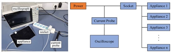 It is seen in Table 2 that the standby and running states of the same appliance are recorded as two categories due to the large difference in currents between the two states. The equipment for data collection and the diagram of the connection are shown in Figure 6. A ZDL6000 oscillograph and a ZCP30 current probe are used for data collection. A 220 V 50 Hz AC power is used for the power supply. The range of the current probe is 30 A. It is noted that the sampling frequency should be high enough to avoid aliasing [29] and information loss. Here, the sampling frequency is set as 50 kHz, and the sampling time is 20 s. Collected current waveforms are shown in Figure 7 and Figure 8. Due to the large amount of data, only the first two cycles of each category are shown.