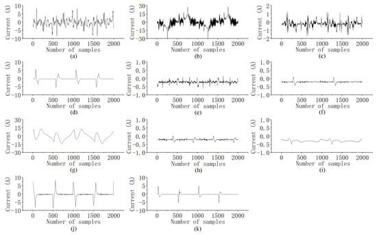 Current waveforms of eleven different appliances: (a) induction cooker (standby); (b) induction cooker (running); (c) desktop; (d) tablet; (e) printer; (f) coffee machine; (g) microwave oven (standby); (h) microwave oven (running); (i) electric soldering iron; (j) laptop; (k) smartphone.