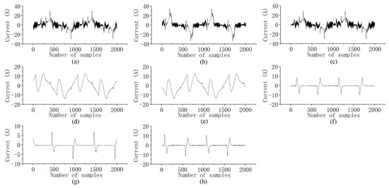Current waveforms of eight different appliance combinations: (a) induction cooker + tablet; (b) induction cooker + microwave oven; (c) induction cooker + smartphone; (d) microwave oven + tablet; (e) microwave + smartphone; (f) tablet + desktop; (g) tablet + smartphone; (h) smartphone + laptop.