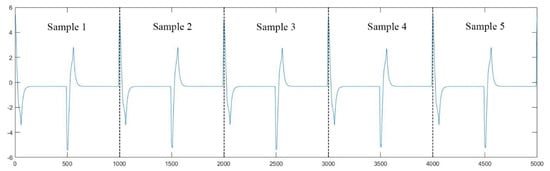 The method for splitting the collected current data to generate samples is as follows. As shown in Figure 9, taking the first five cycles of the waveform of tablet + smartphone, for example, each cycle of the waveform is taken as a sample. For each category, with a sampling frequency of 50 kHz for 20 s, 1 million data points are finally collected, and there are 1000 data points in each cycle of the waveform. Thus, the raw data of each category can be divided into 1000 samples. The total number of samples for ESEAD is 11,000, and the number of samples for EMCAD is 8000. For the training model, each dataset is further divided into the training set, the validation set, and the test set with a ratio of 7:2:1. Each sample in the dataset will be encoded as an image, which is used for training or testing for the model.