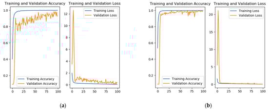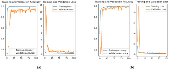 Model accuracy and loss graphs: (a) GAF-ResNet-S model; (b) iGAF-ResNet-S model.