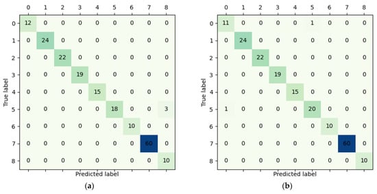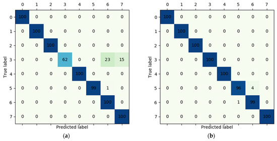 Confusion matrices: (a) GAF-ResNet-M method; (b) iGAF-ResNet-M method.