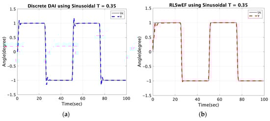 The purpose of this section is to provide a comprehensive comparison of several widely used model-following self-tuning techniques, including recursive least square, recursive least square with exponential forgetting, auto regressive moving average, extended least square, and extended least square with posterior residuals, when applied to DC motors. The focus is on their performance. In this regard, after identifying the state-of-the-art methods in the previous section, these will then be compared with the discrete deterministic artificial intelligence approach presented in Equation (14). This comparison will be carried out using both sinusoidal and Pontryagin-based trajectory-generation methods. Moreover, the comparison between continuous and discrete deterministic artificial intelligence will be analyzed in terms of trajectory-following accuracy and input value range. It is expected that the results of this comparison will demonstrate the superiority of the discrete deterministic artificial intelligence method augmented with Pontryagin-based trajectory-generation method.