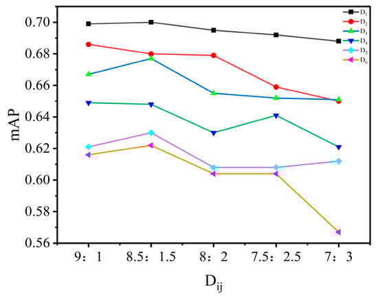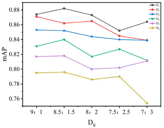 When using the two mAP reference standards, the mAP values of the network models obtained from training after Di was divided using Di1 or Di2 were similar. Therefore, in future practical applications, there is no need to continue the subdivision of the proportion between Di1 and Di2.