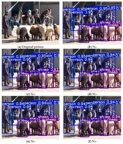 Figure 4, the same number of objects are detected in (b)–(f), and all of them are six persons and five sheep, because the overlapping of sheep objects in the pictures increases the difficulty of detection, resulting in one sheep object not being detected. The detailed data are shown in