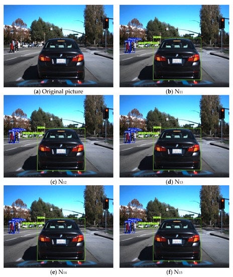 Figure 5, it can be obtained that the same number of objects are detected in (b)–(e), which are three person objects and four car objects. The overlapping of prediction frames resulting in the accuracy rate of individual objects cannot be seen, three-person objects and two-car objects are missed at the same time, and the detailed data are shown in